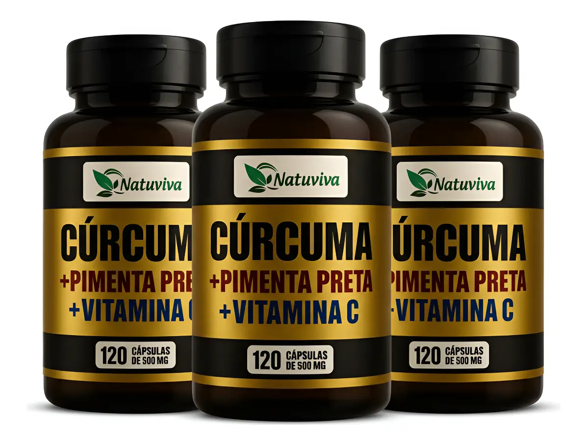 Este KIT NATUVIVA é a escolha ideal para quem quer estoque para meses ou para dividir com a família. Ele combina três potes com fórmulas poderosas: Cúrcuma (anti-inflamatória), Pimenta Preta (potencializadora de absorção) e Vitamina C (antioxidante que também reduz a inflamação, conforme destaca o Healthline). São 360 cápsulas no total – um custo-benefício imbatível.