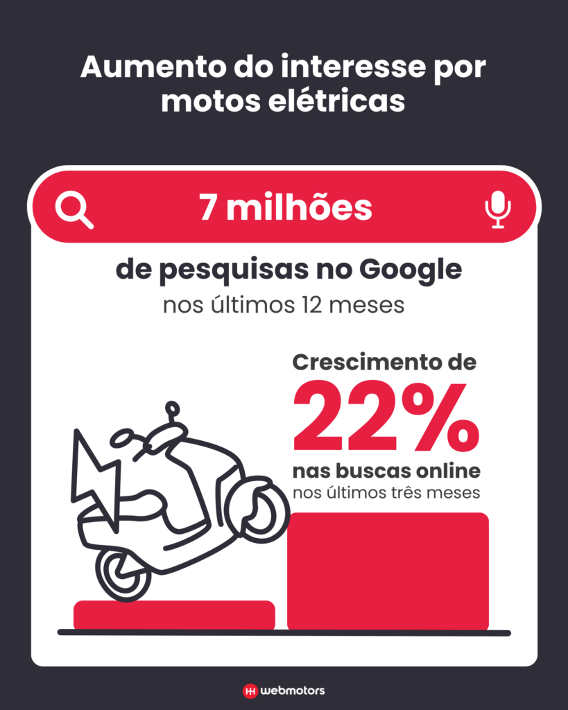 Um levantamento realizado pela Webmotors, maior plataforma de compra e venda de veículos do Brasil, revela que o número de pesquisas pelo termo “motos elétricas” nas plataformas de buscas online alcançou a marca de 7 milhões nos últimos 12 meses, com um crescimento expressivo de 22% nos últimos três meses.