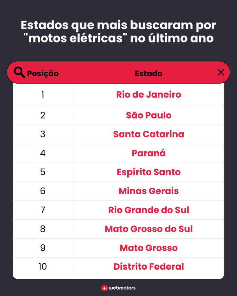 Entre os estados com maior volume de buscas online no último ano, o Rio de Janeiro lidera o ranking, reflexo de um cenário em que os veículos elétricos de duas rodas já circulam com frequência nas ruas da capital. Em seguida, aparecem São Paulo, Santa Catarina, Paraná e Espírito Santo.