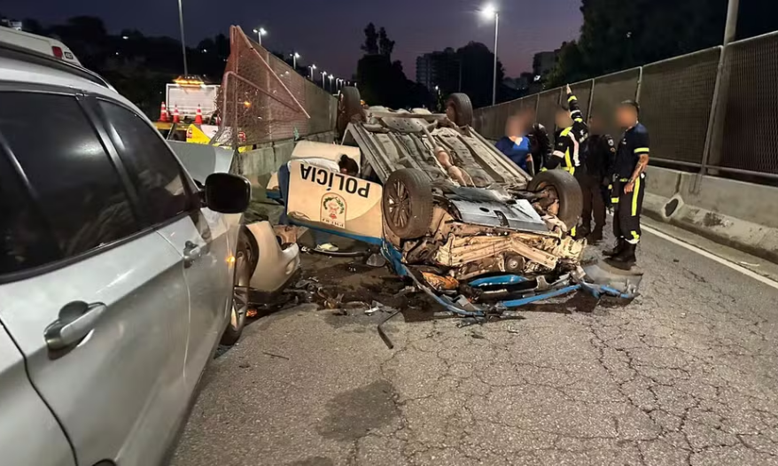 Uma viatura da Polícia Militar foi atingida por um carro de passeio em alta velocidade na manhã deste domingo (24), em um dos acessos da Linha Amarela, no Rio de Janeiro.