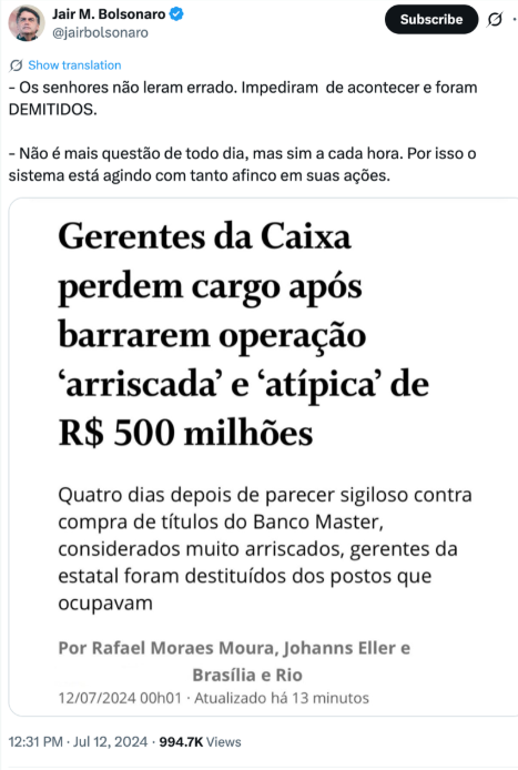 A publicação de Bolsonaro, de julho de 2024, comentava uma reportagem do jornal O Globo que indicava que gerentes da Caixa Econômica foram demitidos após barrar uma operação de R$ 500 milhões em compras de títulos do Master, considerada “arriscada” e “atípica”.