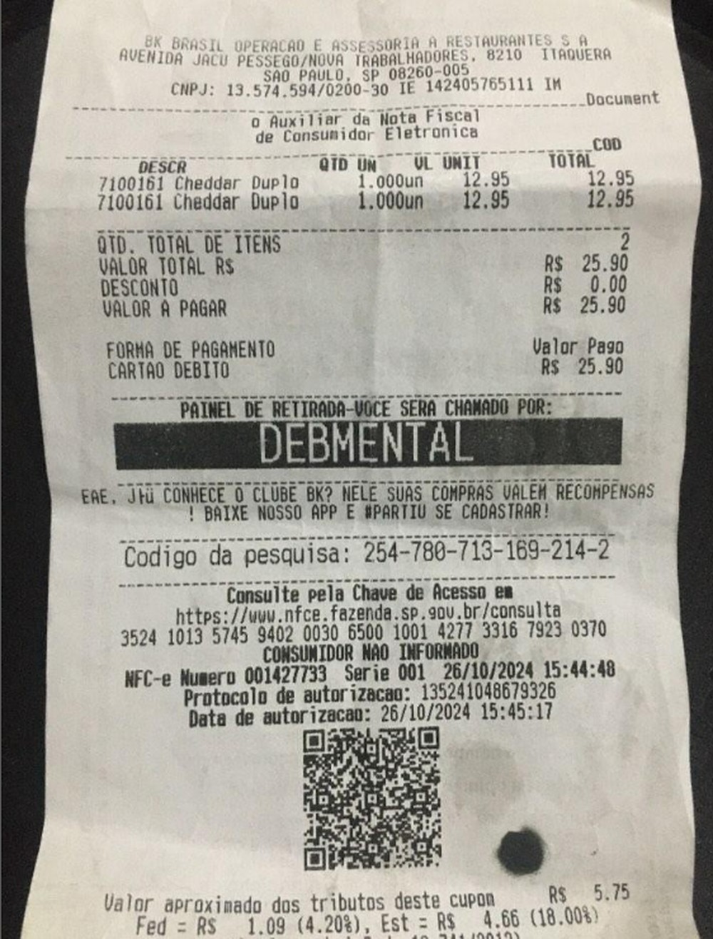 Uma funcionária do Burger King na Avenida Jacu-Pêssego, em Itaquera, Zona Leste de São Paulo, foi demitida após identificar uma cliente que fez uma compra pelo drive-thru, no último dia 26 de outubro, com o termo ofensivo “debmental” no campo reservado ao nome.