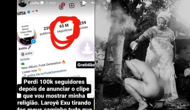 A cantora Anitta relatou a perda de 100 mil seguidores no Instagram após publicar fotos em um terreiro de candomblé, sua religião. Em seus Stories, a artista celebrou a mudança, afirmando que “Laroyê Exu tirando dos meus caminhos tudo que não me serve mais”.