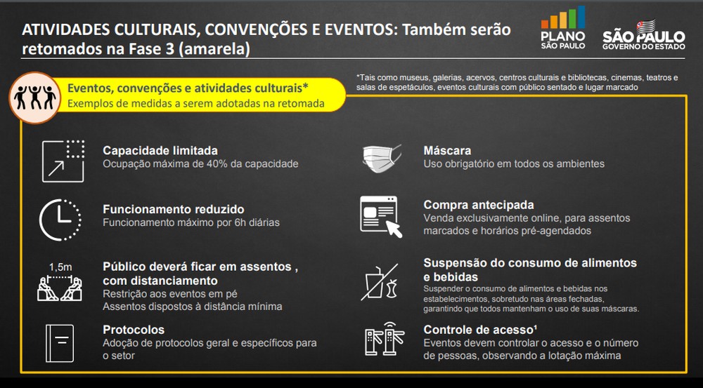 Para os setores econômicos de eventos e atividades culturais, como, cinema e teatro, será necessário fazer a elaboração de um protocolo de funcionamento e ainda adquirir um documento aprovado pela vigilância sanitária. Porém, o governo do estado já decretou as restrições que deverão ser seguidas para reabertura, são elas: