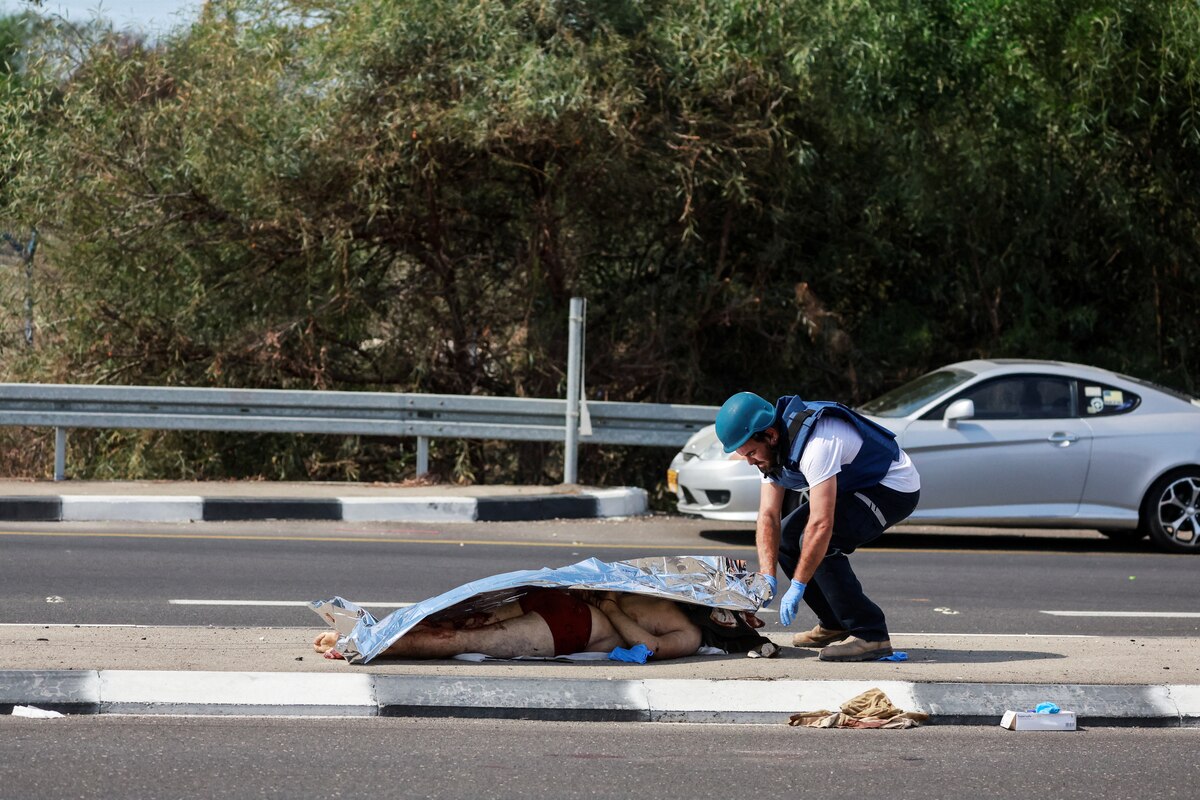 Um paramédico israelense cobre o corpo de um israelense morto e despido no ataque do Hamas (Reuters)