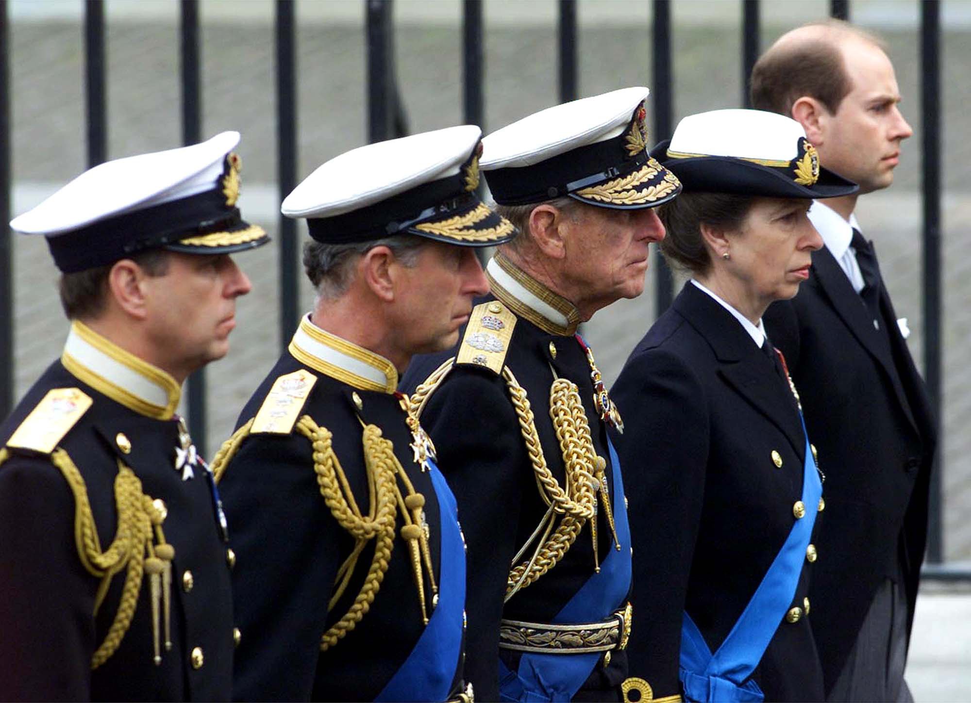 Membros da família real britânica seguem o caixão da Rainha Mãe a caminho de seu funeral na Abadia de Westminster, em Londres, em 9 de abril de 2002. A partir da esquerda: Príncipe Andrew, Príncipe Charles, Príncipe Philip, Princesa Anne e Príncipe Edward. (AP Photo / Santiago Lyon)