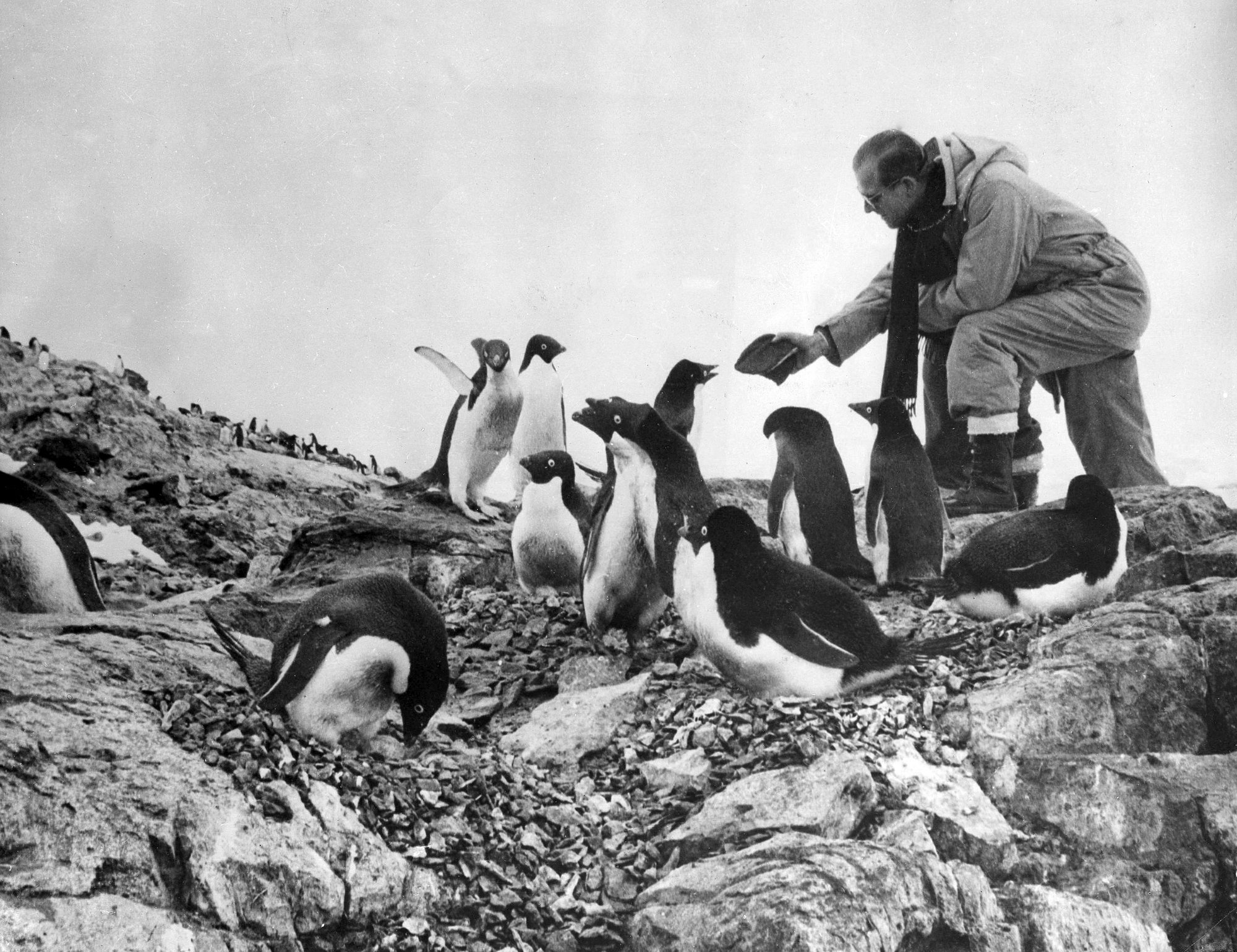 Príncipe Phillip, o duque de Edimburgo alimenta uma colônia de pinguins durante uma visita à Antártica em 8 de fevereiro de 1957. (AP Photo)