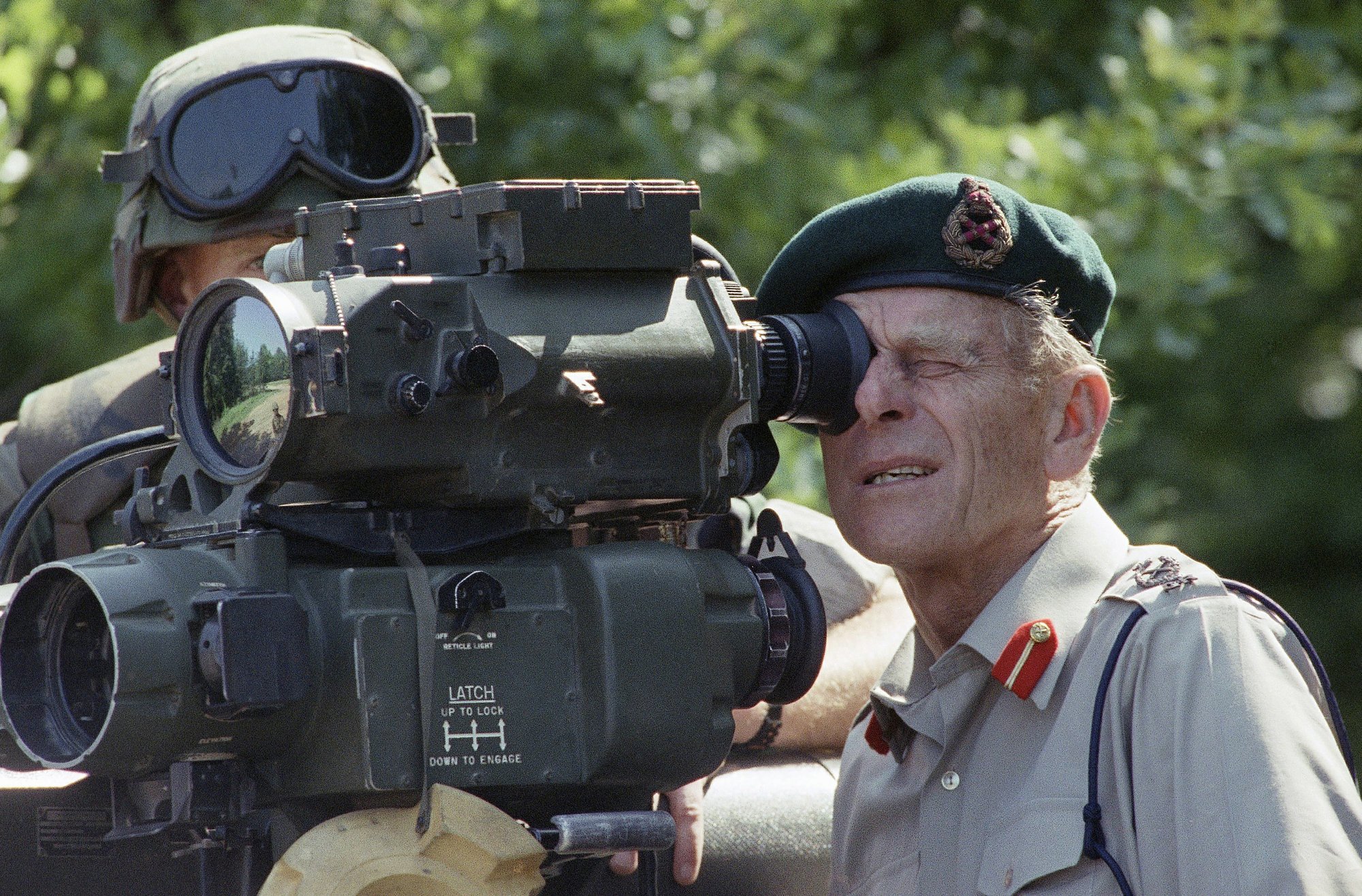 O príncipe Phillip da Grã-Bretanha aperta os olhos ao ver um lançador de mísseis TOW na Base Marinha de Quantico, na Virgínia, em 15 de maio de 1991. Foto da AP / Dennis Cook)