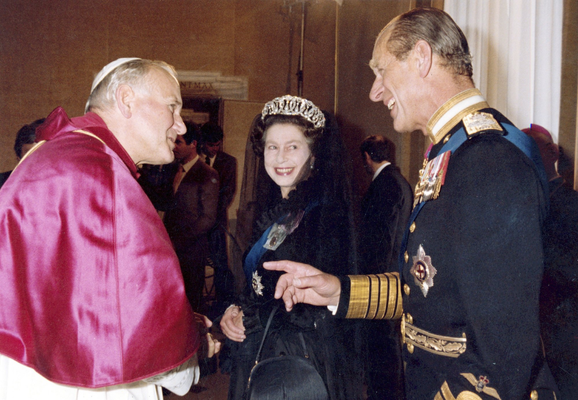 A rainha Elizabeth II da Grã-Bretanha sorri para seu marido, o príncipe Philip, durante uma audiência com o Papa João Paulo II em seu estúdio particular no Vaticano, Itália, em 17 de outubro de 1980. (AP Photo / Arturo Mari)