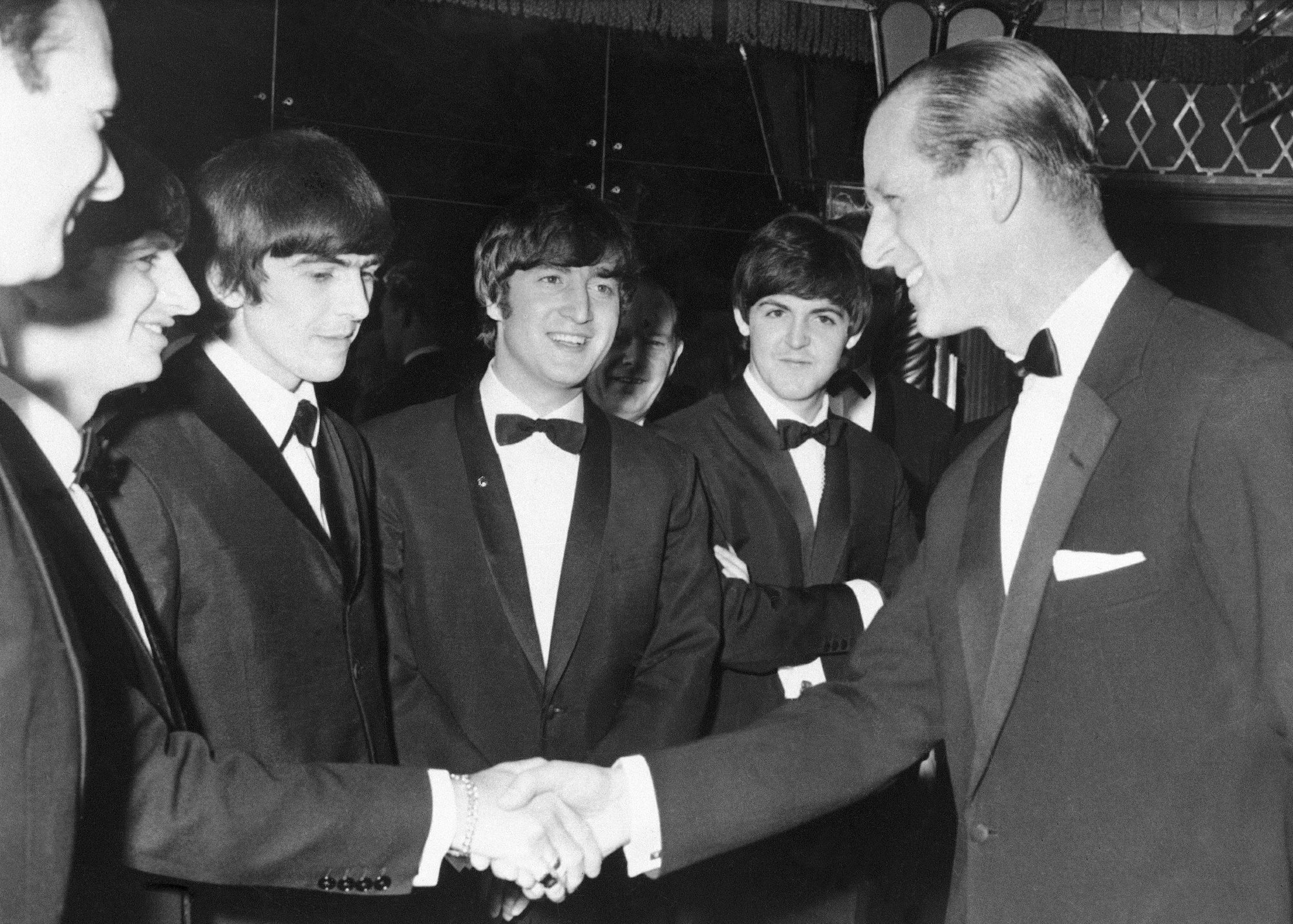 O príncipe Philip da Grã-Bretanha aperta a mão de Ringo Starr como co-Beatles da esquerda, George Harrison, John Lennon e Paul McCartney olham, no Empire Ballroom em Londres, Inglaterra em 23 de março de 1964. (AP Photo / Pool)
