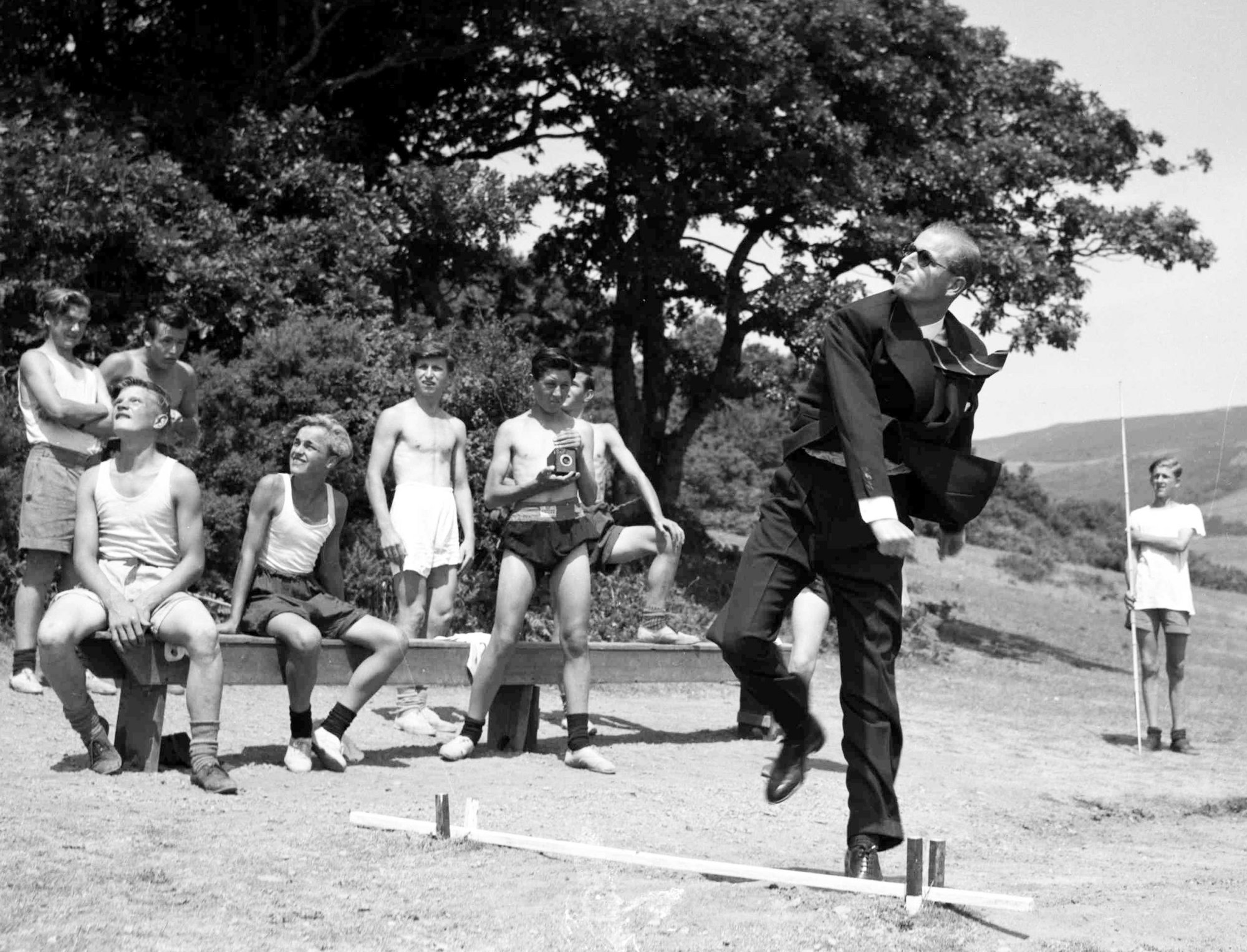 O duque de Edimburgo atira um dardo durante uma visita à Outward Bound Sea School, no País de Gales, assistida por alguns dos meninos em 12 de julho de 1949. (AP Photo / Leslie Priest)
