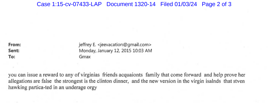 De acordo com o documento, o pedófilo condenado ofereceu uma “recompensa” a qualquer conhecido de Giuffre que pudesse provar que as alegações eram falsas.