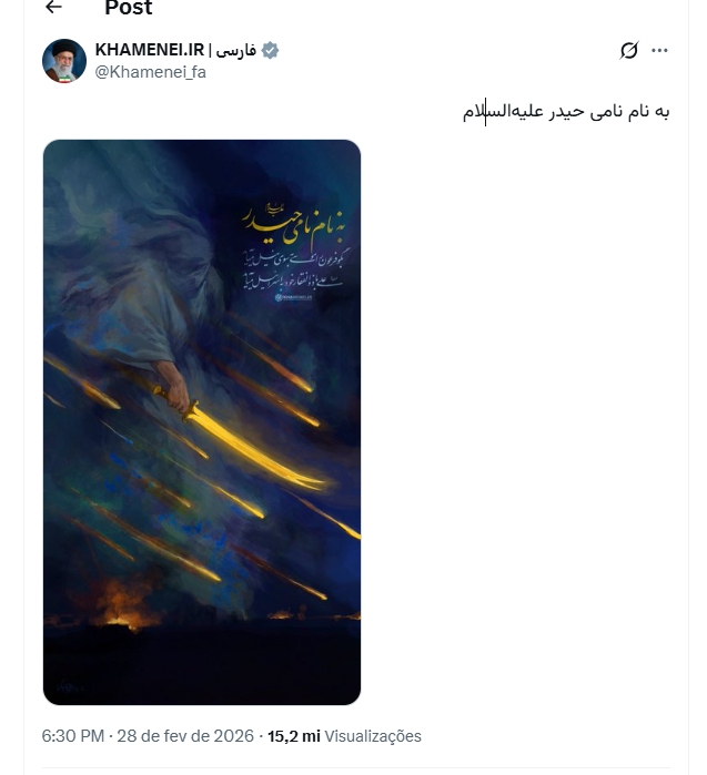 “Em nome do nobre Ali, que a paz seja com ele”, publicou a conta oficial de Ali Khamenei, líder supremo do Irã, abatido neste sábado durante ataques conjuntos de Estados Unidos e Israel em Teerã.