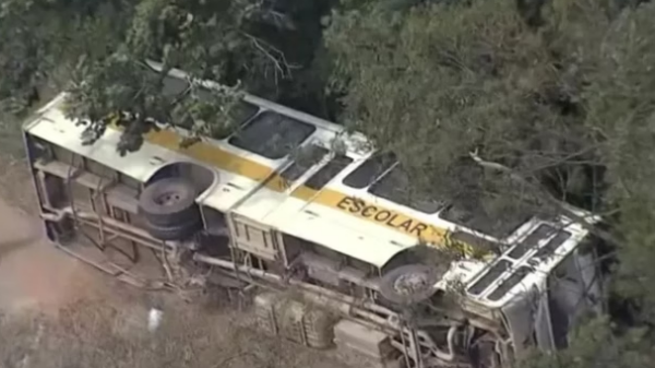Um ônibus escolar tombou na tarde desta segunda-feira (25) na rodovia SP-214, na altura do município de Embu-Guaçu, região metropolitana de São Paulo. O...