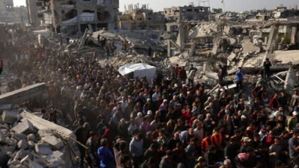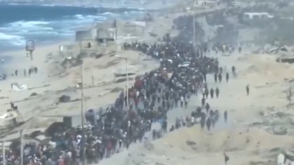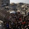 Milhares de palestinos marcharam na quarta-feira (26) entre os escombros de uma cidade gravemente destruída no norte da Faixa de Gaza, no segundo dia...